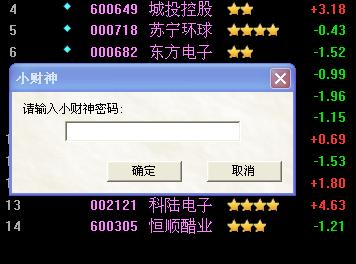• 同花顺技术部: 这是因为你设了用户密码保护,小财神密码即是您登录同花顺的登录密码,如果您要取消的话,您在登录小财神后点击“账户”菜单栏,将“用户密码保护”前面的勾去掉即可。