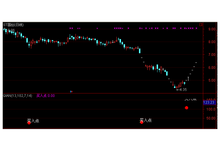 当满足条件BUY1ANDCOUNT(BUY1,15)=1时,在V5位置书写文字,画红色