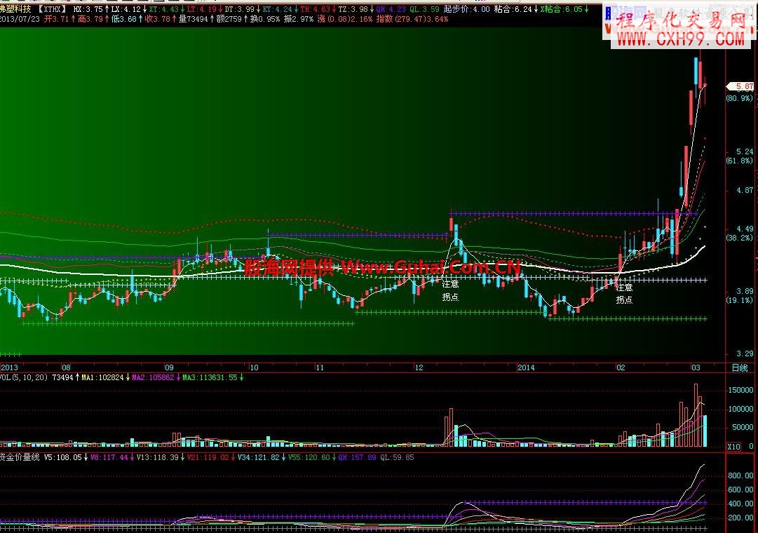 飞狐资金价量线副图源码此指标的后两句含有波峰波谷函数系飞飞狐函数,前面指标为通用源码。发此指标仅仅是给大家提供一个思路而已,公式中的参数和EMA等可以根据自己的喜好而调整。我不希望大家生吞活剥地下载指标。而图中的十字星线是后二句用来观察波峰波谷的,可以起提示参考作用,其中的参数也可以调整,十字星线是用来测量天量地量的。