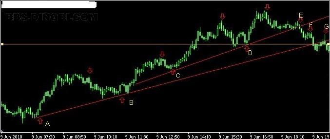 每一组趋势线由两条组成——趋势顶(上轨线)和趋势底(下轨线)。在一定时期内,价格是按照趋势的通道在前进。趋势线并不一定是平行的,虽然在实际操作中,趋势线大多数是平行或接近平行。可以看出,在上图中,A\B\C\D四处出现了“趋势突破”,随后价格就改变了趋势。这也就是趋势线的作用。