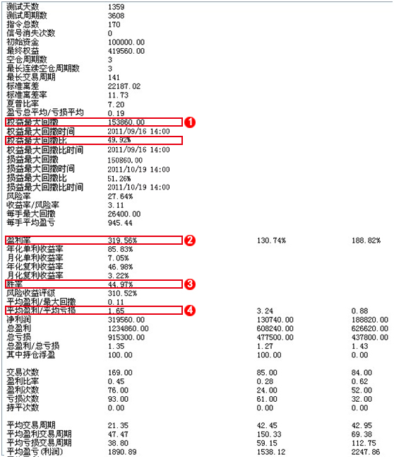 下图是一个分析报告的一部分,图中②、③指标是我们通常最关注的数据,很多人会认为盈利率高,胜率高的模型就是好模型,真的是这样的么?让我们再来看看图中的①、④衡量指标。