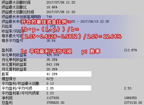 例如著名的凯利公式,可通过胜率和盈亏比计算出开仓的最佳资金比例;凯利公式f*=(b*p -(1-p))/b,其中f* 为开仓最佳资金比例、b为模型的平均盈利/平均亏损、p 为胜率,在测试报告中,平均盈利/平均亏损和胜率均已经算出,我们只需要把这些数据代入公式中就能得到模型最优的开仓比例,如下图。