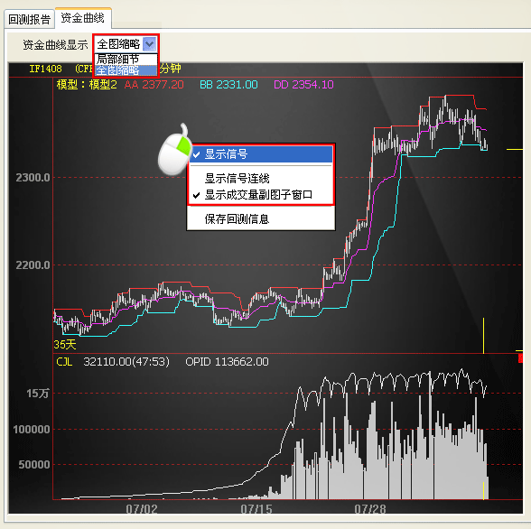 全局缩略:软件会自动显示加载起止时间所有的数据,以及完整的资金曲线形态,投资者可清晰看到软件资金曲线的整体情况。