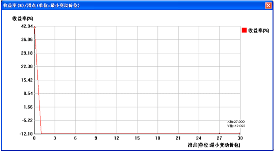 让我们从一个二维关系去审视这个模型,看一下滑点和收益之间的关系:从下图可很明显的看出,滑点每增大一点,收益率就会大幅下降;当滑点为2个最小变动价位的时候模型已经失去了盈利能力。而实际交易的时候,我们很难做到0滑点,这个模型也就很难盈利。
