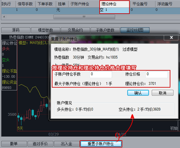 解决办法:如下图,通过“重置子账户持仓”功能,将交易账户中的持仓带入到模组,就可以保持理论账户和交易单元持仓匹配。