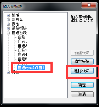 感谢您对交易师的支持!请您在想要删除的自选板块个股上面,鼠标点右键,选择【加入到板块】会出现如下窗口,选中您要删除的板块后点击【删除板块】即可。如有问题,请咨询在线客服或拨打4001868106!