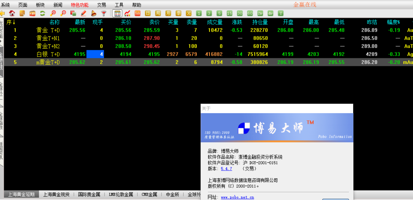 各位大师那么好,我现在用的是深圳黄金投资有限公司的金赢在线,应该也是你们开发的产品不,版本号是5.47,你们用的是什么软件,是博易大师还是博易云,我下载了你们的产品博易大师,但是没有账号无法登陆,也不知道在哪里注册,是不是不可以直接用,怎样才可以用到最新版本,怎么注册,谢谢大家了,还有你们正在开发的带有云自动止盈止损的功能软件是在哪可以用上,谢谢,希望有人回答我谢谢了。