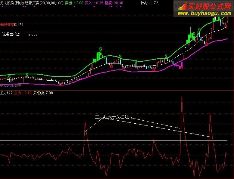 经长时间观察,与大家分享,主力线大于关注线,越大越好,注意是越大越好,从选股公式中选出一个主力线大于关注线且是最大的,嬴钱概率大于90%以上,超短线超作,1-3天,不要贪心;有未来但不景响选股,还可以选出好多这样的股票。