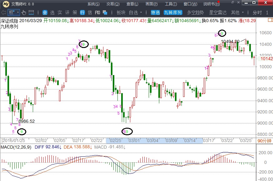 九转序列是市面上极为少见的择时策略,思想源于迪马克的TD序列,我们经过了大量的数据比对,认为只计数9在转折点上的效果特别好,甚至有一点神奇。如图:深证成指90分钟的一波行情,两个低9分别是两波调整的低点,两个高9分别是两波反弹的高点。