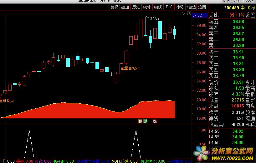 3. 强势线:类似于飞狐线,由最近25个交易日的收盘价计算得出,强势线的值为前25个交易日收盘价的移动平均值加上该移动平均值的6%。当股价高于强势线时,表示股票相对较强。