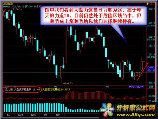 [大盘力道]是根据市场交易安全定位核心标准开发出的全新区域安全评测系统,可以有效的判断大盘和个股的安全度,安全区域分别为45上和45下 45上包含45的时候就代表大盘和个股目前处于安全区域,在安全区域中我们就可以大胆操作并可以适当重仓,那么如果力道显示45以下时代表了目前大盘或个股属于危险区域,在这样的情况下我们的操作方式可采取为空仓不操作或轻仓操作方式这样极大的保护了我们的资金安全,达到稳中求胜的效果了。当大盘和个股处于上升状态时,相对应的力道也是在逐渐的加大,大盘和个股的上涨过程往往都是由低到高的走势,但是没有发生之前我们并不能够判断大盘或这支股票是否要上涨,但是我们通过力道可以看出在危险区域中力道不断的加大,但始终处于危险区域时我们的操作方式是轻仓操作,而当力道不断提高达到45和45以上时就是我们加仓的最好时机,这样将一个波段完美的操作完毕了。